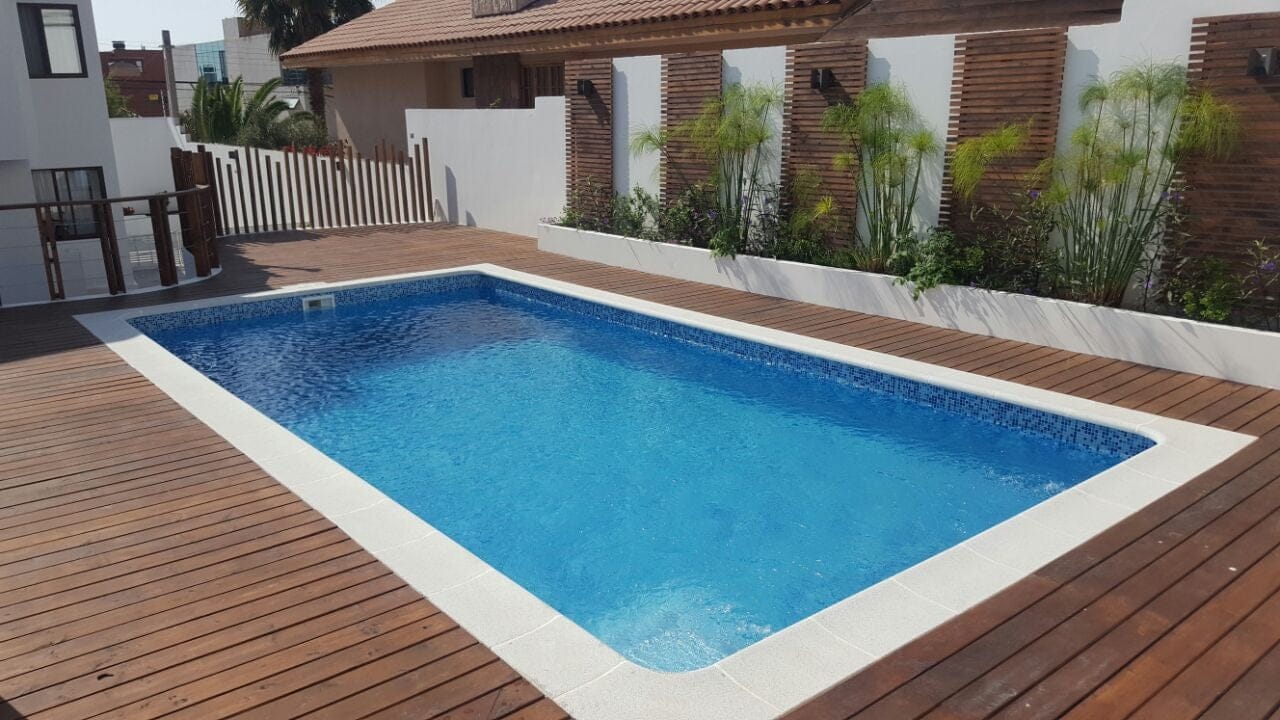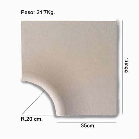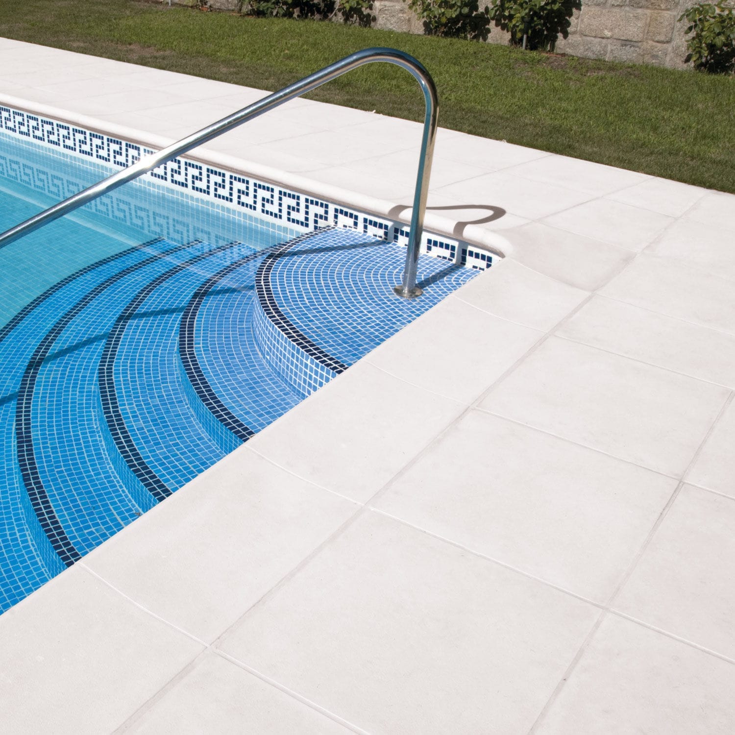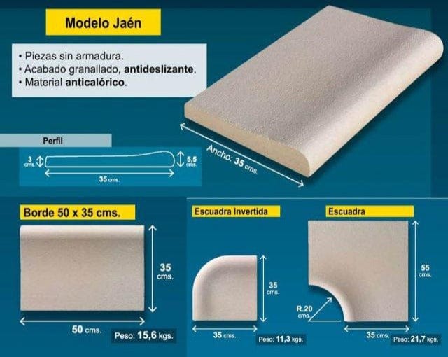 Borde de piedra reconstituida antideslizante y atérmico. Excelente terminación sin orificios en la superficie.