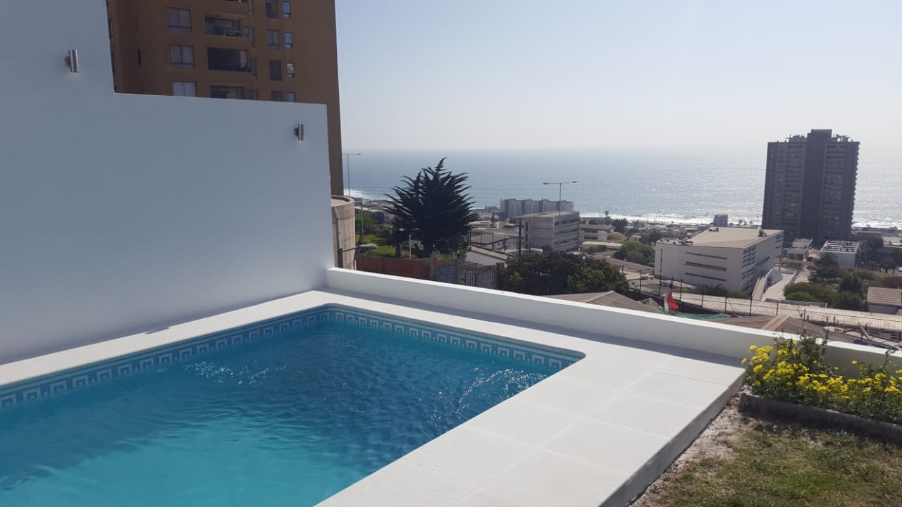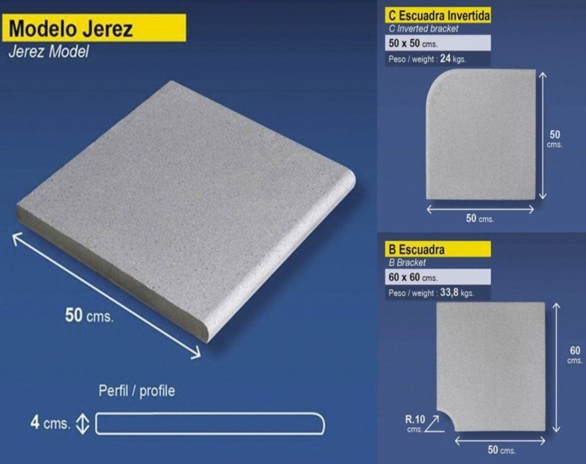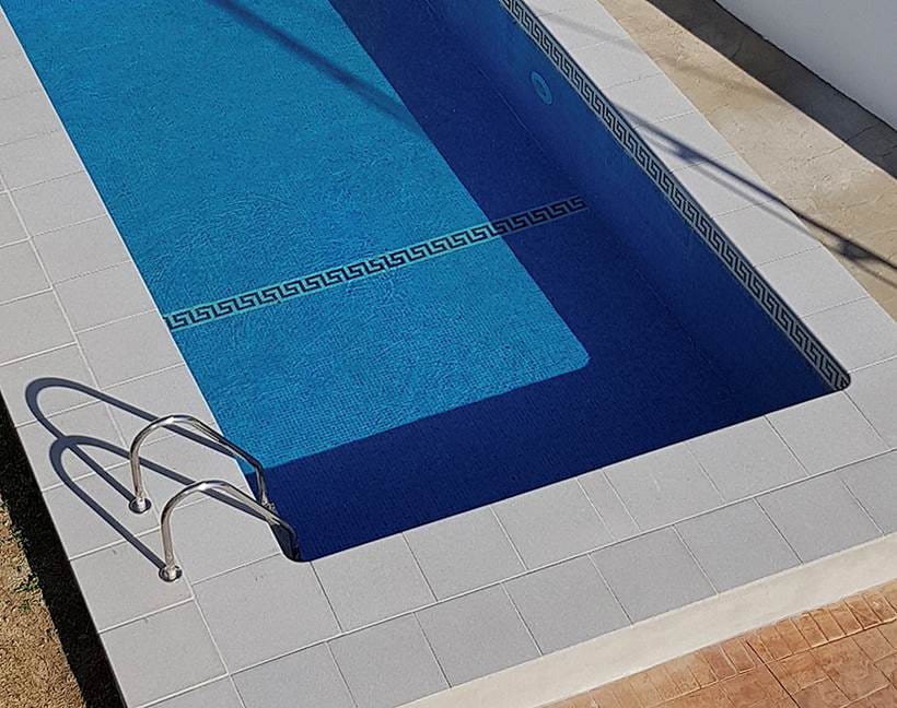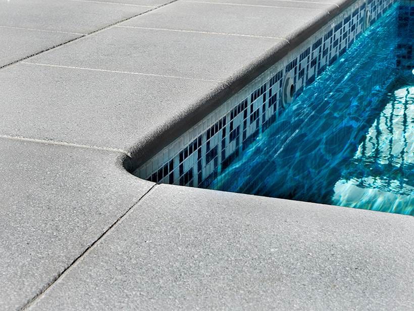 Borde de piedra reconstituida antideslizante y atérmico. Excelente terminación sin orificios en la superficie.